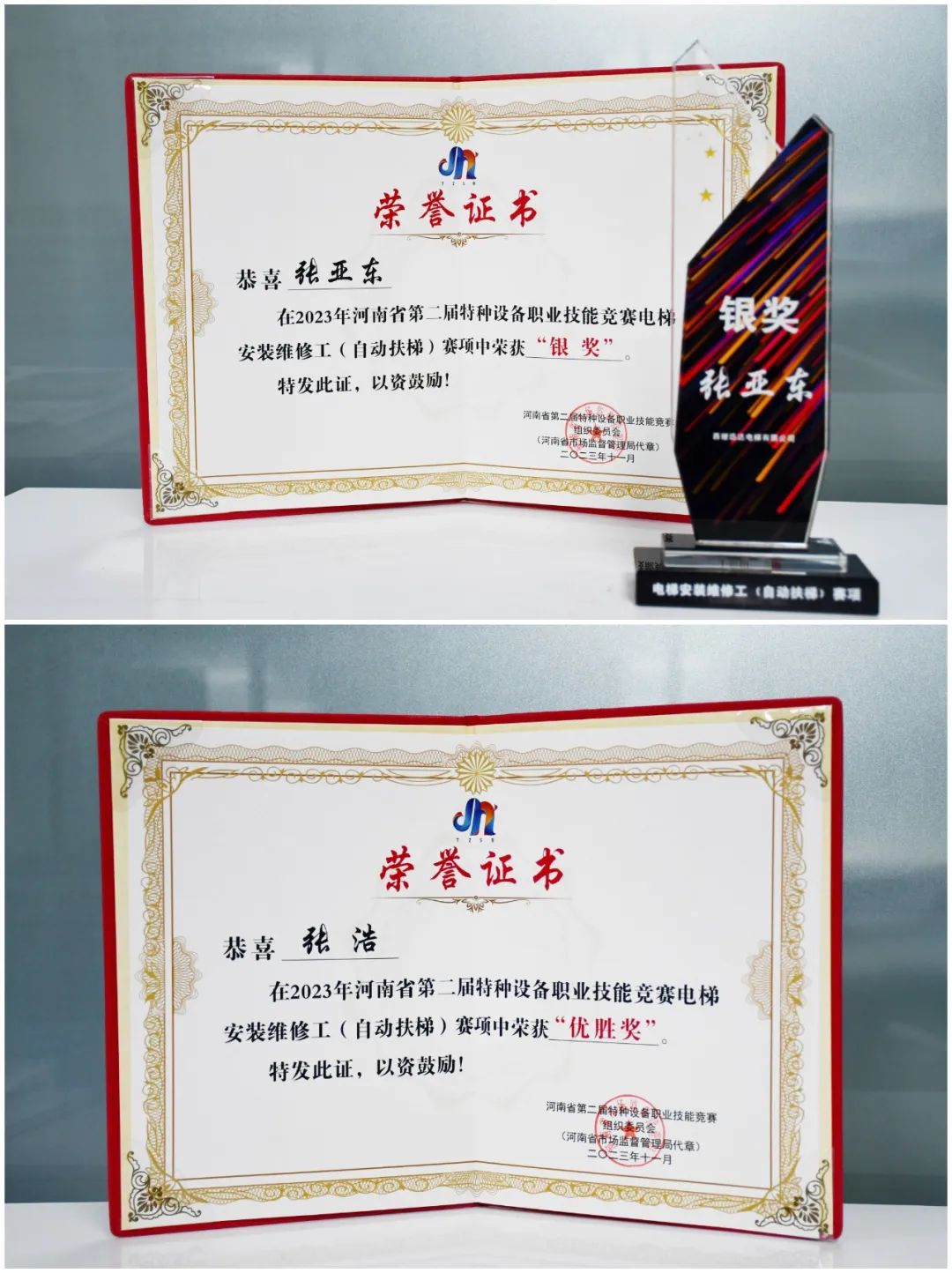 會上,河南省鍋爐壓力容器檢驗技術科學研究院院長、黨委書記馬江東馬院長為西繼迅達電梯頒發“優秀突出貢獻獎”,為參賽選手張亞東頒發電梯安裝維修工(自動扶梯)賽項的銀獎證書以及獎杯,為參賽選手張浩頒發電梯安裝維修工(自動扶梯)賽項的優勝獎證書。