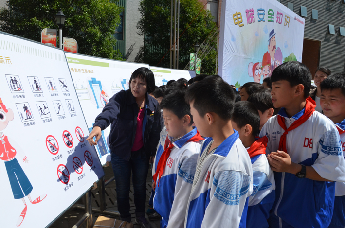 此次安全知識進校園活動,西繼迅達電梯的工作人員,為廣大師生準備了圖文并茂的宣傳展版、生動活潑的知識講解、以及制作精美的安全手冊。在東城區實驗學校大操場上,兩千余名師生興趣盎然地觀看了電梯安全知識宣傳版面,公司工作人員向師生耐心講解電梯的基本結構、相關安全保護裝置、乘梯時注意事項等等。活動現場,公司還向師生贈送了兩千余安全乘梯知識手冊。在隨后的“電梯知識專題課堂”上,公司工作人員走進學校教室,通過生動形象的講解課件和發放禮品互動環節,使同學們更加直觀、更加全面的了解電梯基礎知識、安全注意事項和應急預防措施。面對“如果電梯鋼絲繩斷了,電梯會不會掉下來?”,“如果被困在里面會憋死嗎?”,“電梯都是由什么組成的?”等問題,由于事先已經學習了部分安全乘梯知識,同學們都爭先恐后地搶答問題,課堂氣氛十分活躍。課堂上,對于講解到的安全乘梯知識,很多同學都拿起筆和本,認真的記下自己所學到的知識。“以前以為困在電梯里一定會被憋死,現在知道原來電梯是有通風裝置和通風口的。今天真是學到了不少東西?!睎|城區實驗中學小學的一名學生興奮地說道?!耙郧翱偸抢壹业男」纷娞?,以后我就知道了,乘坐電梯一定要抱起寵物,”另一位小學生開心的說道。