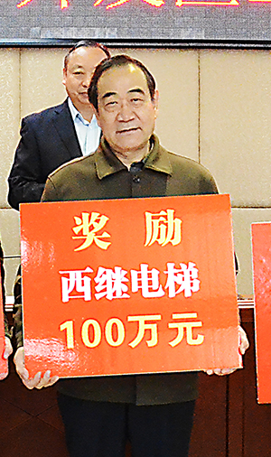 3月4日上午,在國家許昌經濟技術開發區召開的2016年度工作會議上,西繼迅達電梯被開發區管委會授予“功勛企業獎”,開發區黨工委書記、管委會主任王民生親自為劉董事長頒發獎牌及獎金100萬。