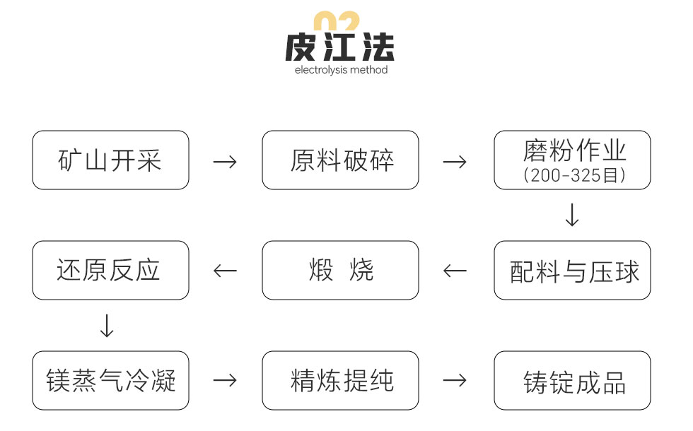 礦山開采→原料破碎→磨粉作業(yè)(200-325目)→配料與壓球→煅燒→還原反應→鎂蒸氣冷凝→精煉提純→鑄錠成品