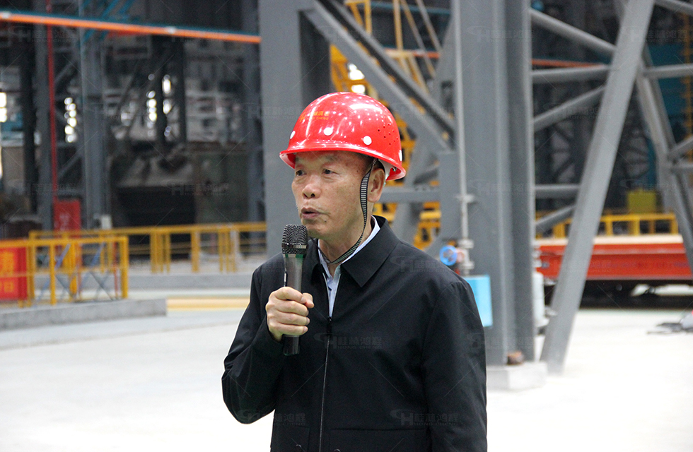 儀式現場,鐵柱鋼梁挺拔而立,灼灼鋼水蓄勢待發。桂林鴻程榮譽董事長容平勛先生和副董事長容北國先生、常務副總梁英女士分別發表致辭。